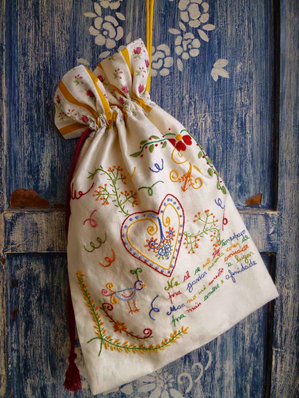 Ela veio visitar-me e resolvi mostrá-lo pelo lado de trás ( onde só se vê um talego de linho forrado a chita) ela achou-o muito bonito, fiquei tão admirada de ela gostar tanto dele simples que pensei : quando o virar qual irá ser a reacção?