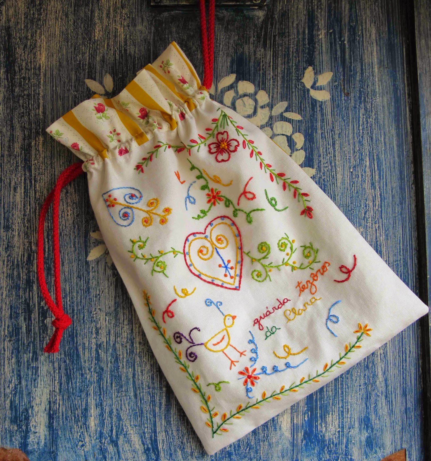 Um coração bordado em estopa de linho com as cores da nossa bandeira juntamente com uma chita de Alcobaça na forma de um talego foi a forma que arranjei para presentear a G..