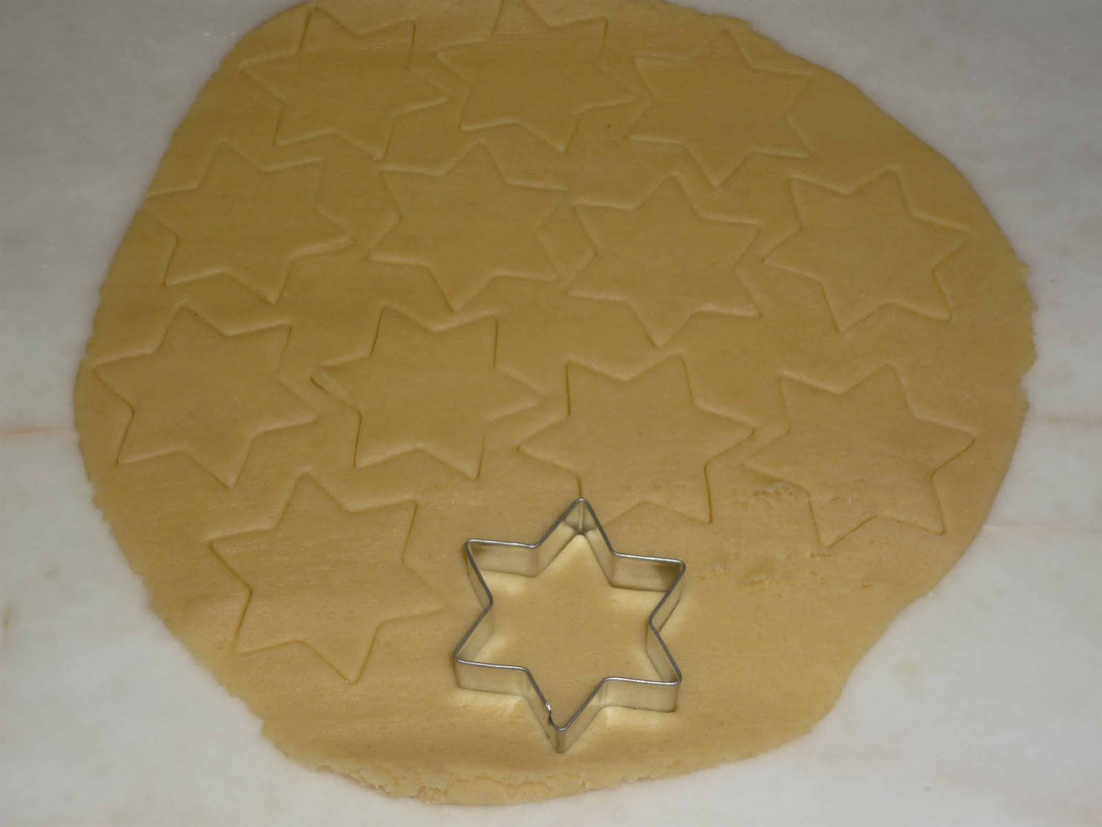 Os procedimentos são os habituais amassar tudo muito bem estender a massa e cortar na forma que se quiser, na receita original corta-se em meias luas mas como estamos no Natal e tenho o cortador da estrela resolvi fazer estrelas.