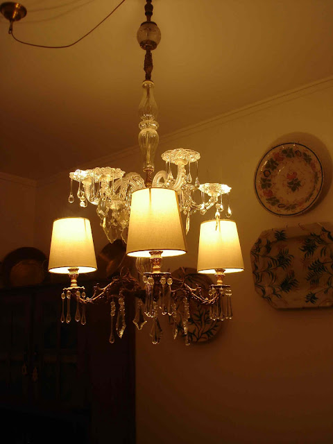 Este verão comecei a empreitada. O meu lustre já dá luz, já está colocado no seu devido lugar mas ainda não está totalmente acabado, isto porque ainda não me decidi como o finalizar. Tenho algumas ideias, para uma delas falta-me o material e cá em Faro não encontro.