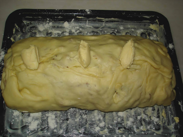 Cobre-se o recheio com a massa fazendo um rolo, coloca-se umas nozes de manteiga por cima e vai ao forno em tabuleiro untado e enfarinhado, até estar dourado.