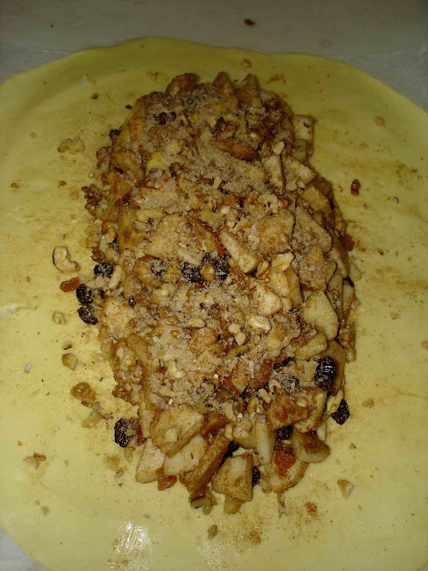 Massa quebrada, comprada feita ( para dar menos trabalho); maçã reineta fatiada; sultanas; corintos; pinhões;nozes picadas;açúcar e canela.