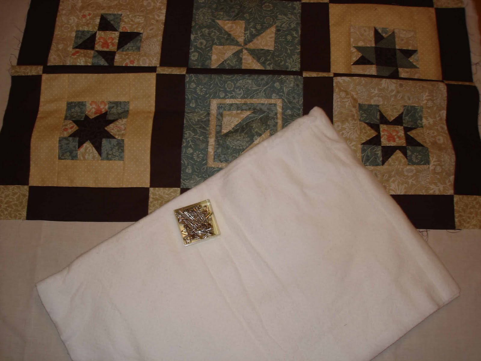 Batting, ( tela de acolchoar) 100% algodão, cetineta de algodão para o back quilt( parte de trás do quilt) e o célebre top quilt que tanto tem sido fotografado e alfinetes de ama (muitos).