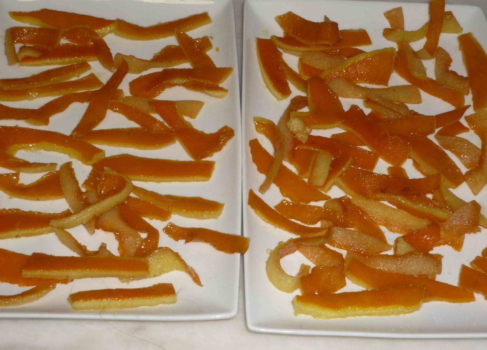 Depois de demolhadas escorro-as e corto-as em tiras. De seguida levo-as a cozer em lume brando numa quantidade de duas partes de laranja para 1 de açúcar. Uso uma taça pequena como medida.