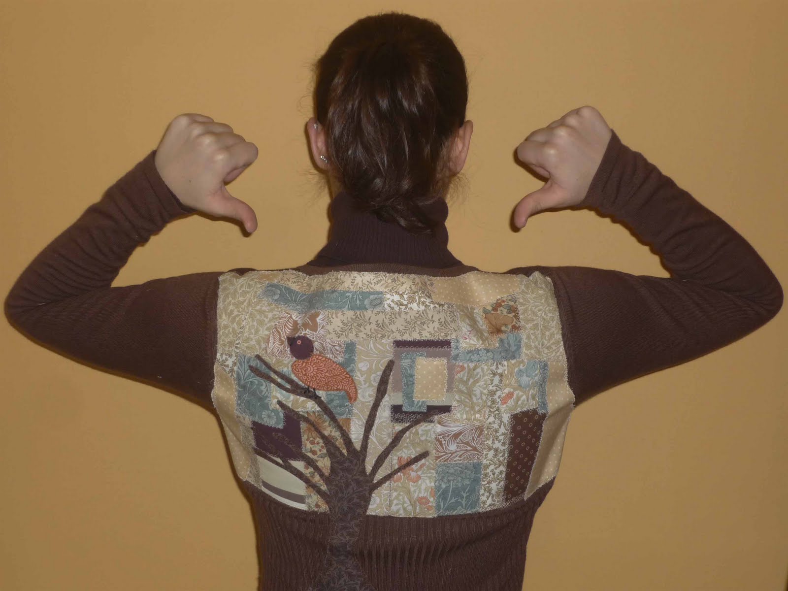 Há muito que tinha decido que coseria uns tecidos aleatoriamente, ao estilo " Desigual" mas foi depois de ter visto este painel que me enchi de coragem e resolvi tentar.Ao acaso cortei restos de tecidos que apliquei a uma tela termocolante que colei à malha do casaco. De pedaço em pedaço fui dando a forma às costas. Depois de colado cosi todos os pedacinhos com um ponto fantasia.