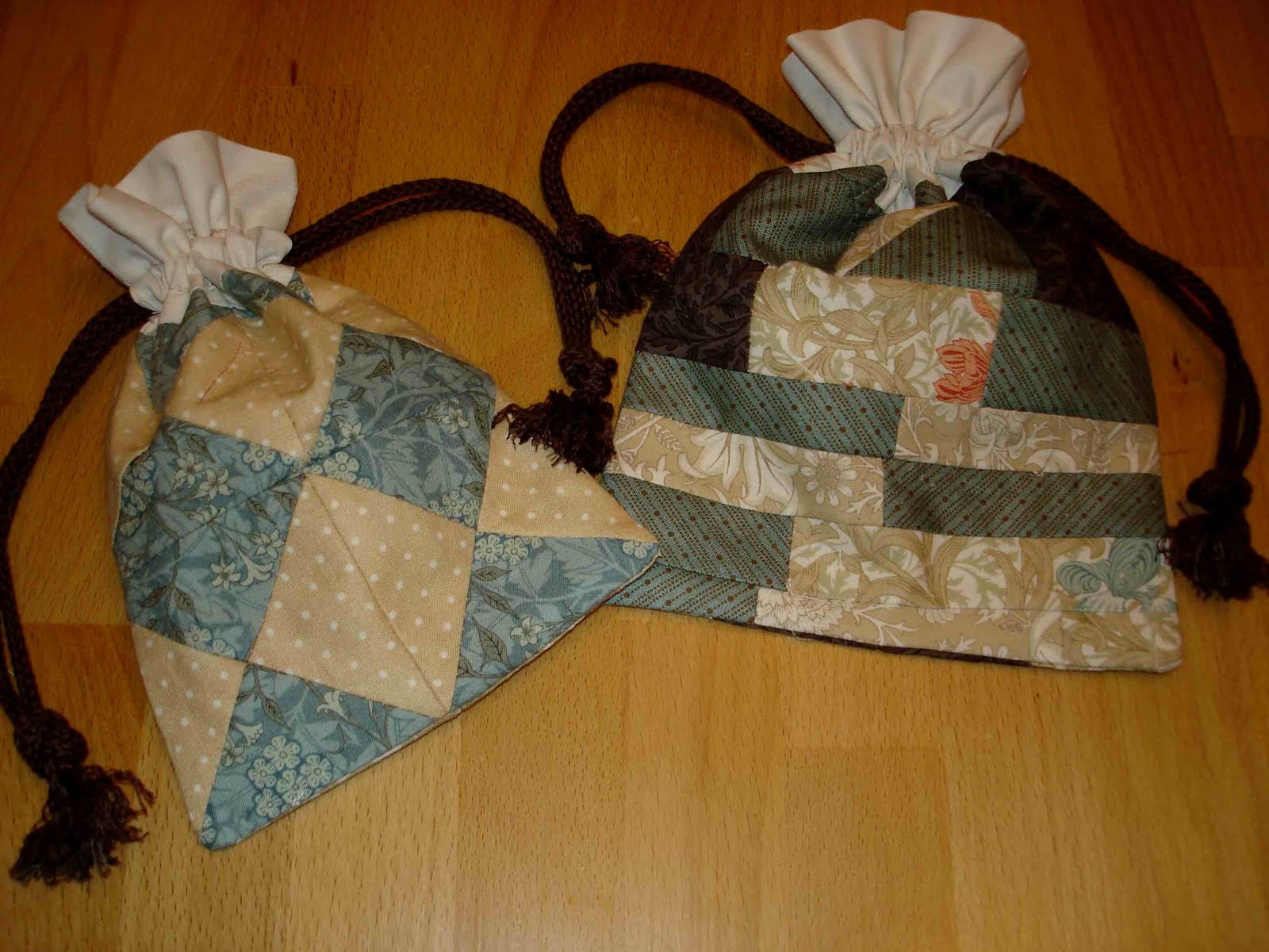 Nesse dia para além de blocos tortos também consegui um "monte" de retalhinhos de tecido. A vontade que tinha, na altura, era jogar tudo fora, mas depois de uma troca de desabafos com a Margarida que me perguntou logo se não dava para aproveitar, contive-me e acabei fazendo mais dois taleigos/bolsas.
