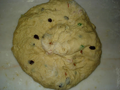 Primeiro faz-se uma pequena massa com a farinha e o fermento deixa-se levedar em ambiente quente ( o truque que uso é colocar a taça em cima do aquecedor a óleo ), depois junta-se as frutas que estiveram a