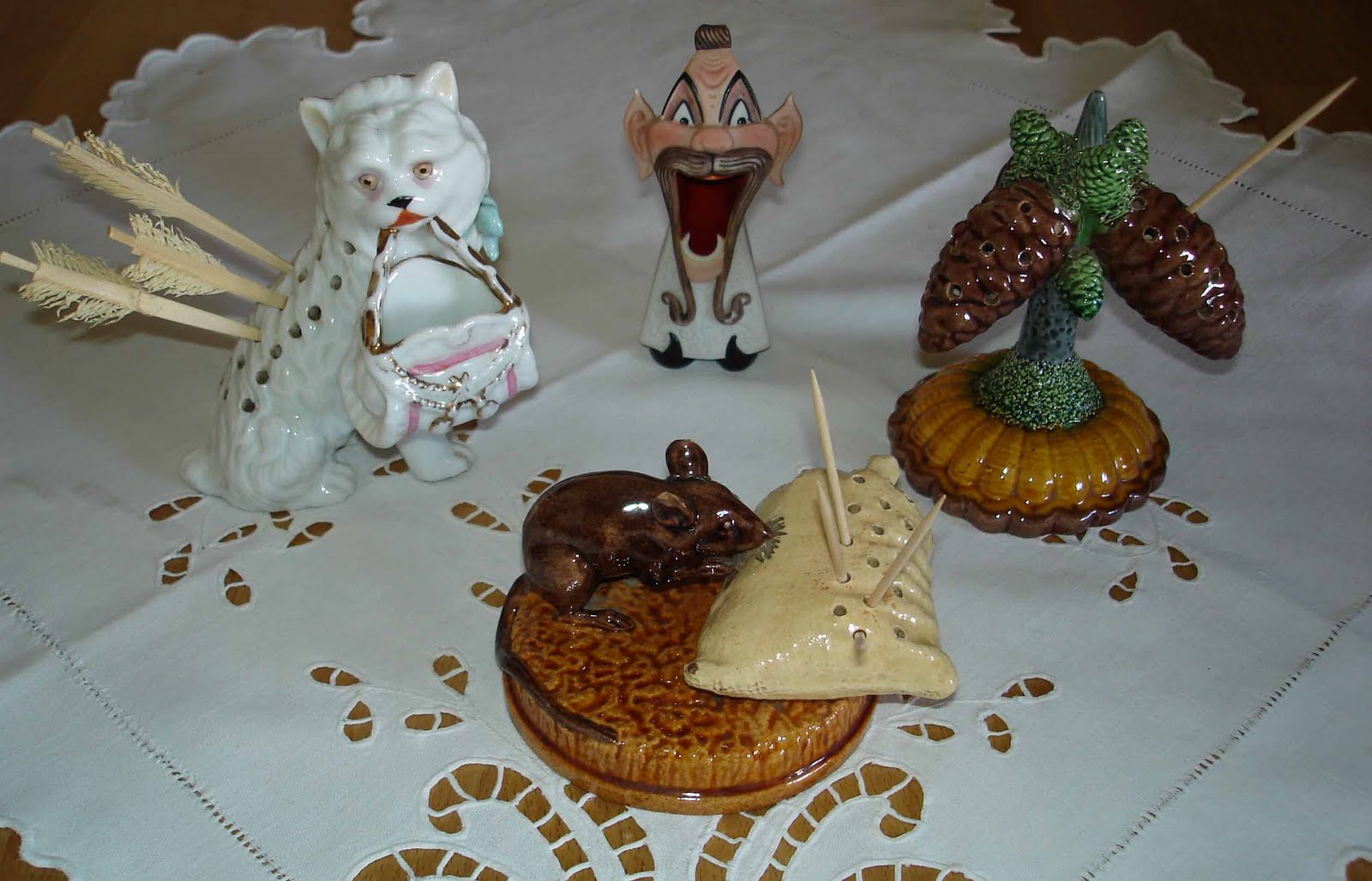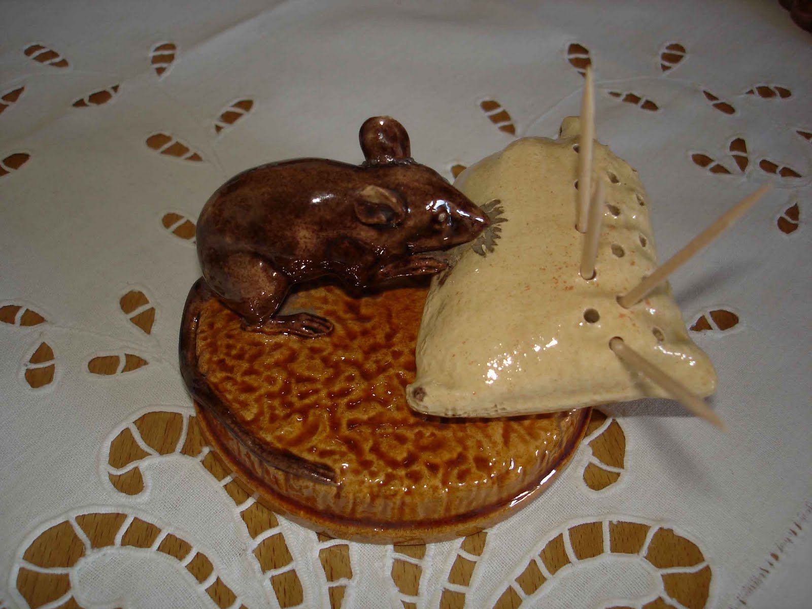 Este é do Rafael Bordalo Pinheiro um ratinho delicioso, cuja cauda acompanha a base do paliteiro, roendo uma saca de farinha.